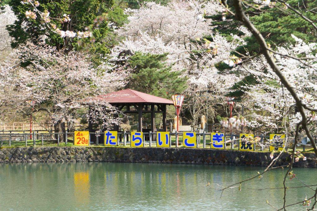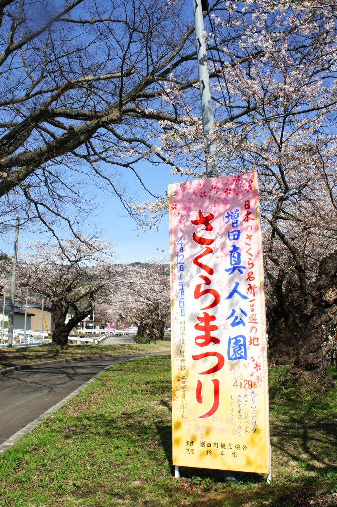 桜の開花にあわせて「真人公園さくらまつり」が開催され、公園沼で貸ボート遊びや増田名物「たらいこぎ競争」が行われます。
